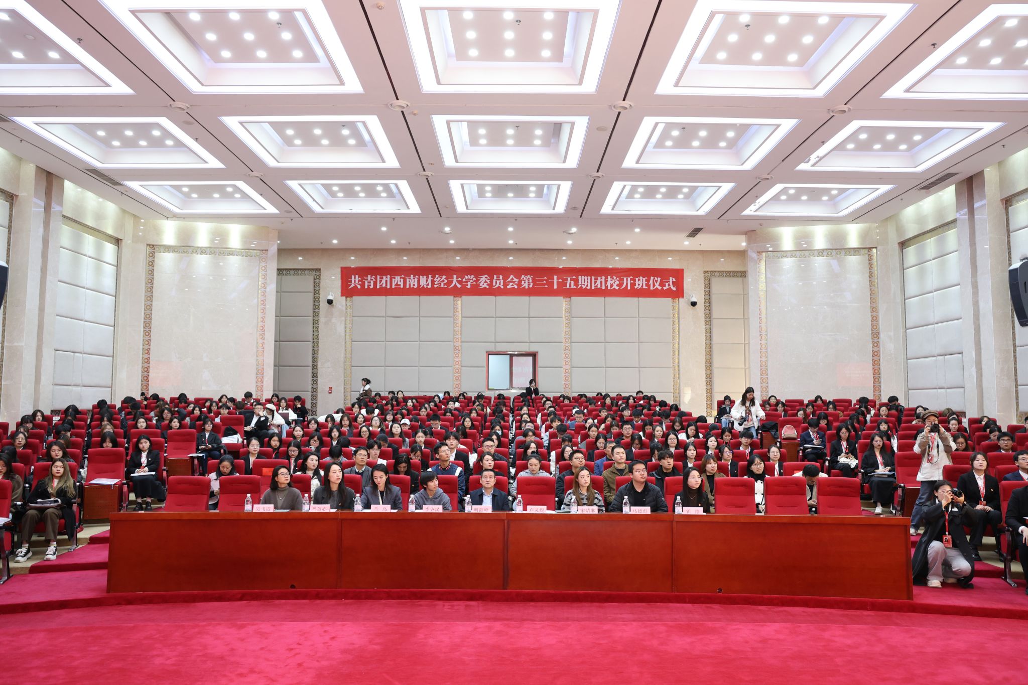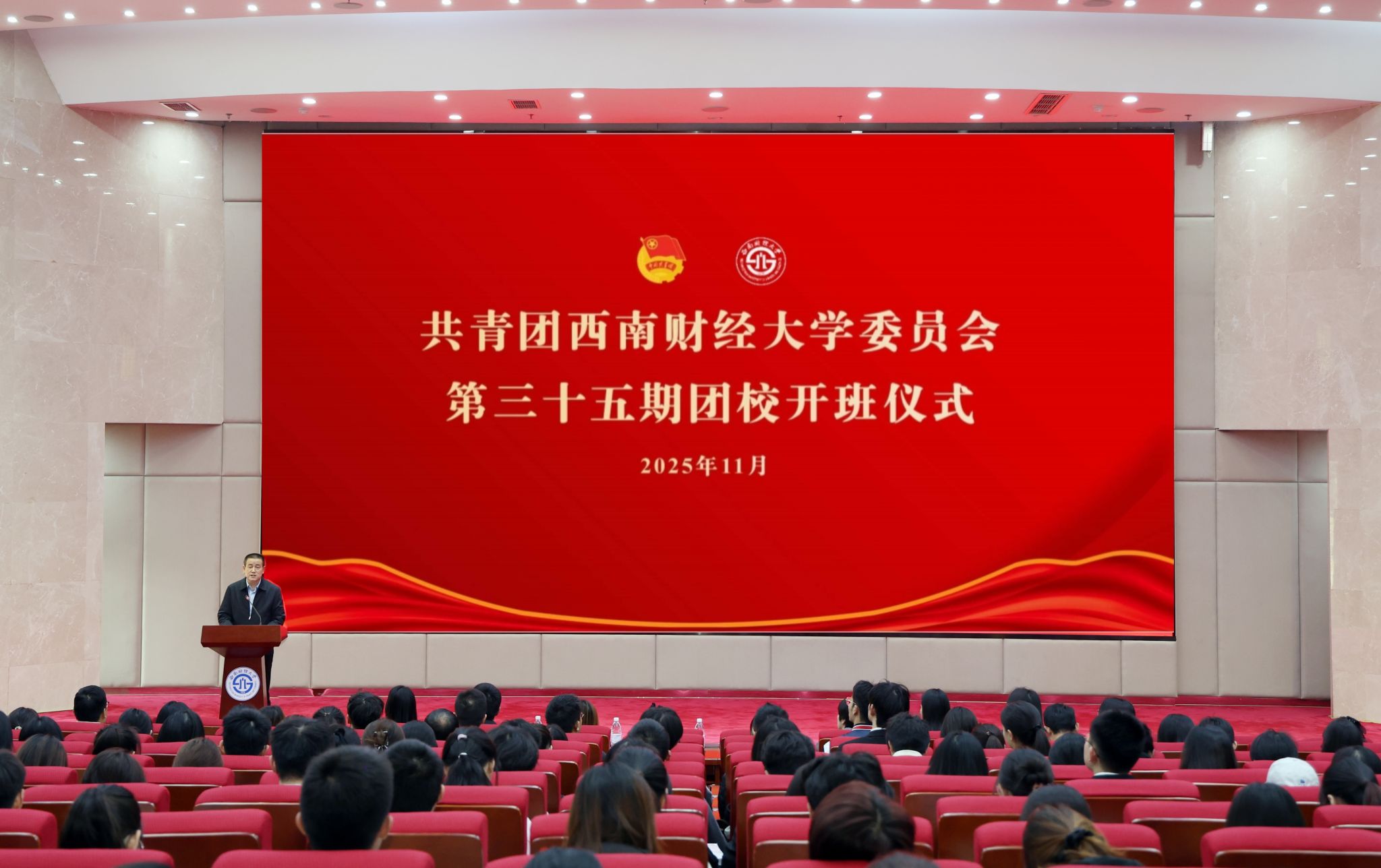 开班仪式在庄严的团歌声中拉开帷幕。全体学员肃立齐唱《光荣啊,中国共青团》,嘹亮的歌声回荡会场,凝聚起新时代西财青年听党话、跟党走的坚定信念。
