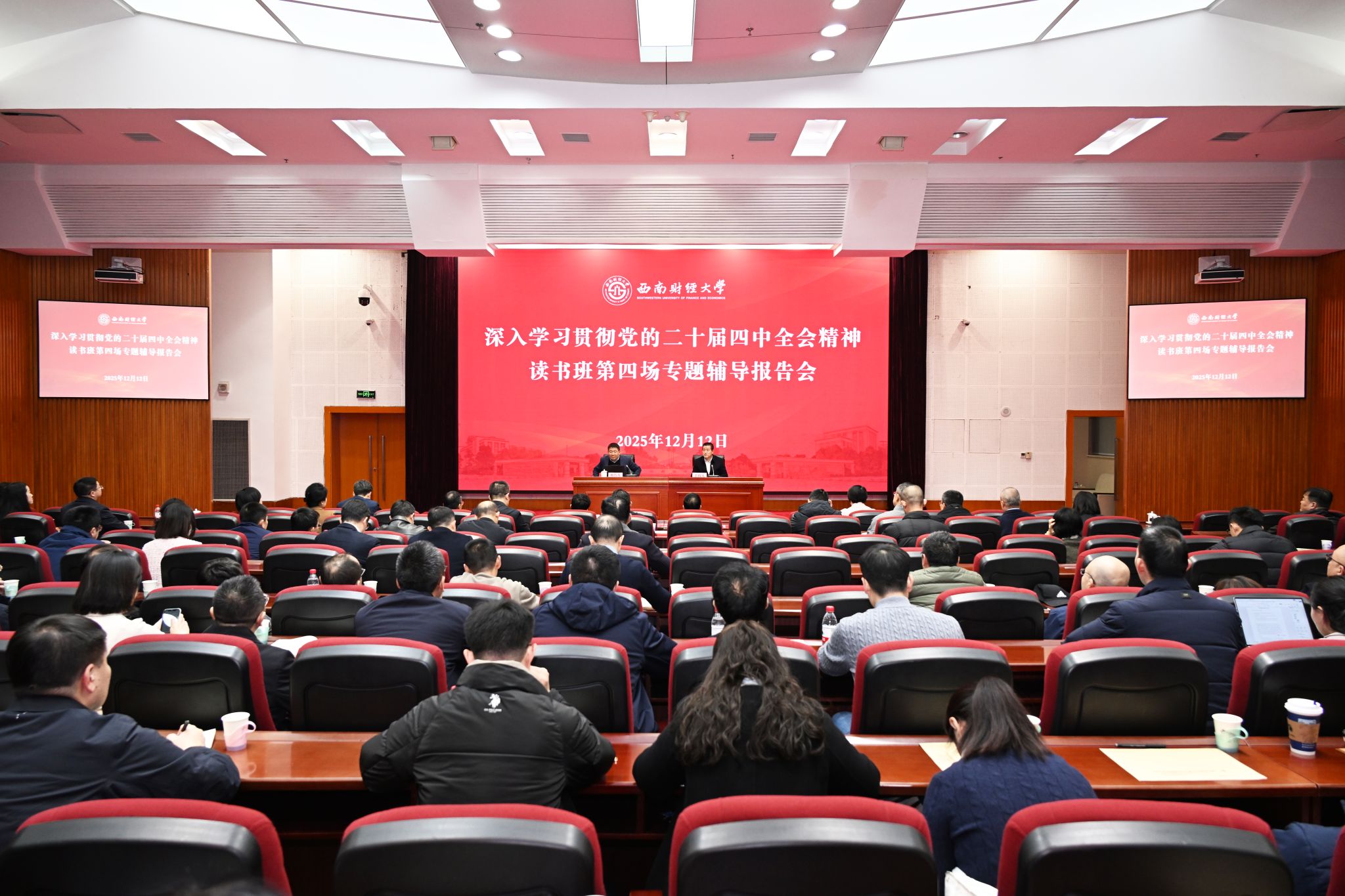 12月12日,学校在腾骧楼137会议室举行深入学习贯彻党的二十届四中全会精神主题读书班第四场专题辅导报告会。学校领导班子成员,党委委员、纪委委员,全体中层干部参加会议。党委副书记明海峰主持会议。