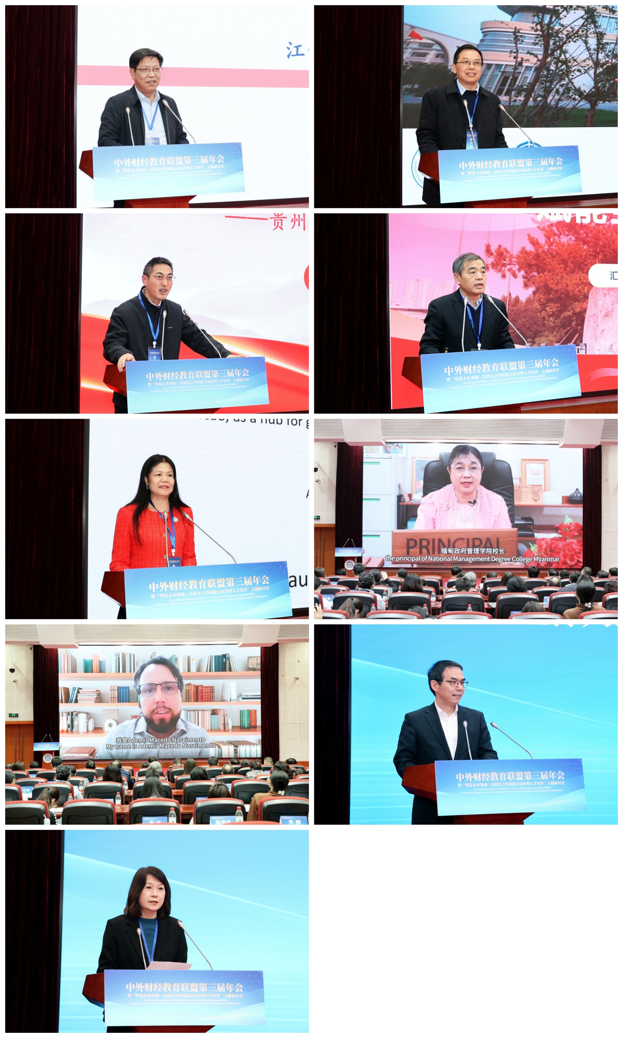浙江工商大学党委副书记、校长王永贵,吉林财经大学党委书记张炳辉,中南财经政法大学党委常委、副校长刘仁山,对外经济贸易大学党委常委、副校长陈德球分别围绕财经大学高质量发展、深耕国际合作、学科交叉与产教融合以及联盟合力教育赋能等作精彩主旨发言。江西财经大学党委常委、副校长袁红林,上海对外经贸大学党委常委、副校长徐永林,贵州财经大学党委常委、副校长杜剑,河北金融学院党委常委、副校长韩景旺,澳门科技大学协理副校长梁文慧,缅甸国家管理学位学院校长钦·蒂达·尼因(Khin Thida Nyein),巴西伯南布哥大学中心主任阿德米尔·马塞多·纳西门托(Ademir Macedo Nascimento)等嘉宾围绕教育国际交流合作与全球治理人才培养等分享前瞻性思考和宝贵经验。学校党委常委、副校长李志生,东北财经大学党委常委、副校长施锦芳主持开幕式及主旨论坛。