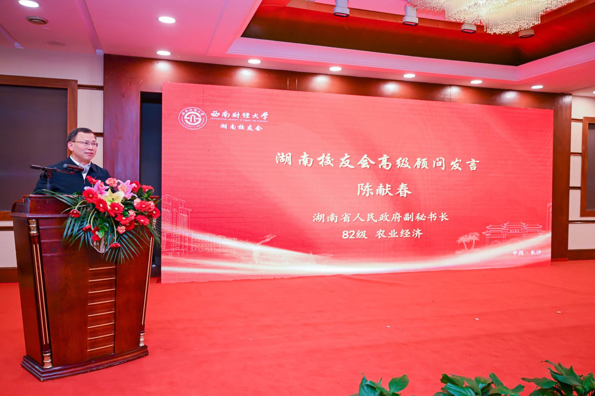 湖南校友会理事会高级顾问、湖南省人民政府副秘书长陈献春热情致辞,并以“新时代呼唤西财校友到湖南校友会建功立业”为题发表主题演讲。他谈到,母校长期以来培育、关爱、支持全体校友成长进步,湖南校友会的成立是搭建母校与校友之间沟通和联系桥梁,是打造整合共享校友资源的重要平台。他表示全体在湘校友将锚定“三高四新”美好蓝图,发挥西财校友经济金融专业优势,在服务加快金融强省建设中抢抓新时代新机遇,积极建功新湖南。