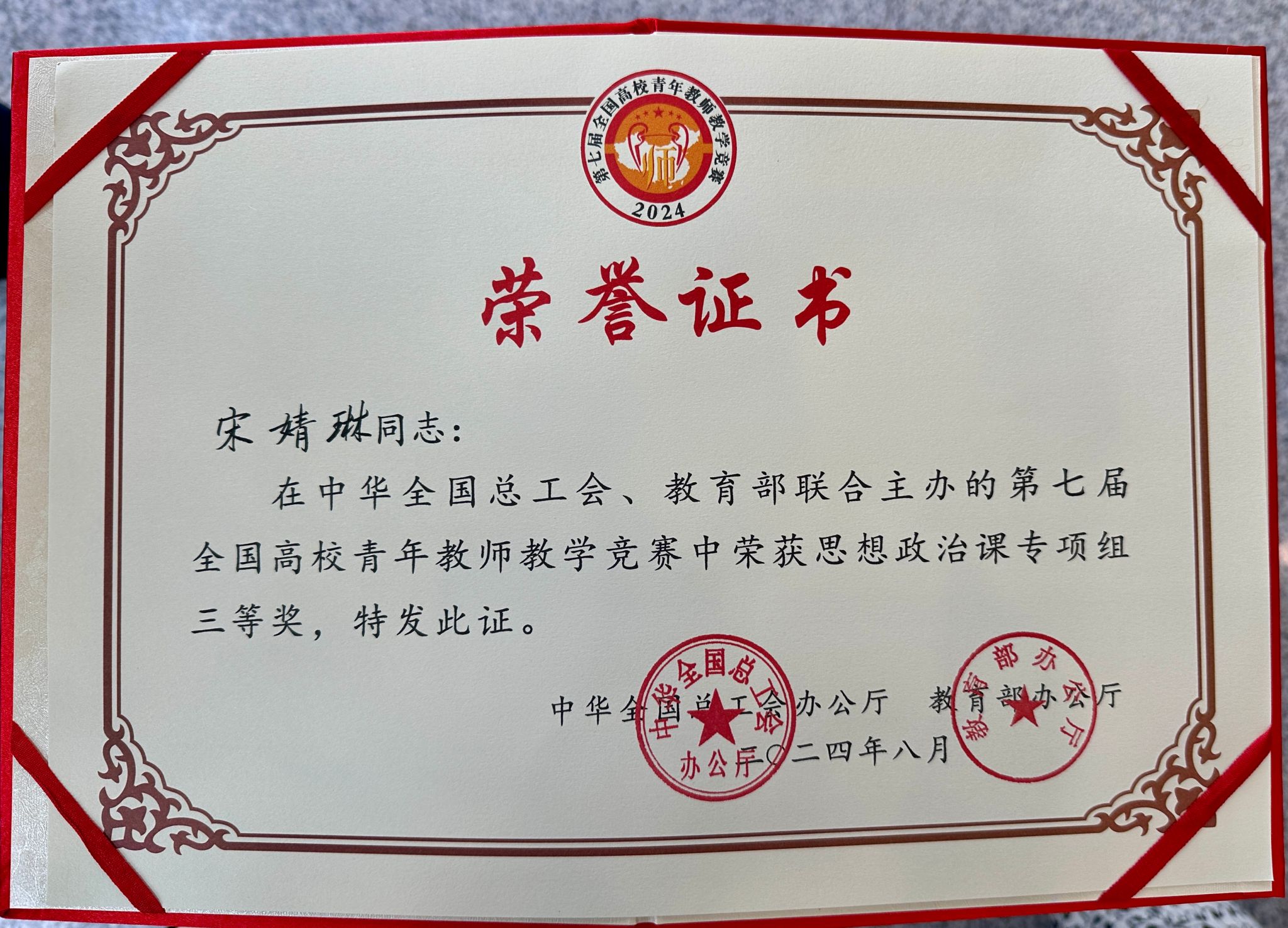 谈到这次参赛和获奖经历,宋婧琳老师收获良多:“经过这次比赛,我深受启发、倍感振奋。学校党委高度重视,备赛过程中各位领导、专家和老师给予我莫大帮助。台上一分钟台下十年功,16个问题的剖析过程,是一个反复论证、反复打磨的过程。青教赛为我们青年教师提供了历练和成长的舞台,未来我将继续保持对教学的热爱,深入践行教育家精神,以更坚定的信心站稳青春讲台,勇攀教学、科研新高峰!”