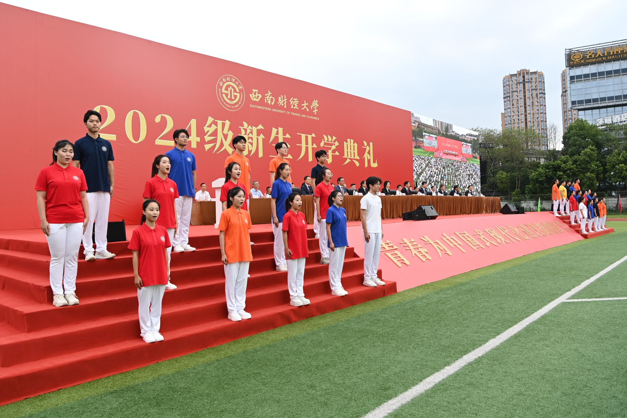 “今天,我抬头凝望鲜艳的五星红旗,心中激荡着青春向党的赤子深情……”颂词铿锵、格言铮铮,2024级新西财人深情感悟青年有为的时代召唤,表示将弘扬“经世济民、孜孜以求”之精神,传承“严谨、勤俭、求实、开拓”之校训,怀抱梦想、脚踏实地,敢想敢为、善作善成,凝聚起民族复兴的青春力量。