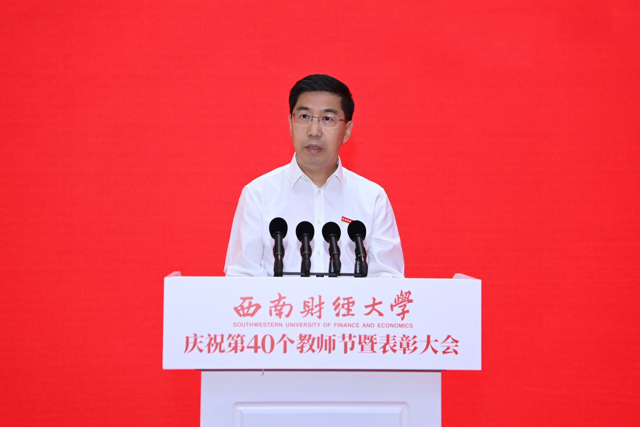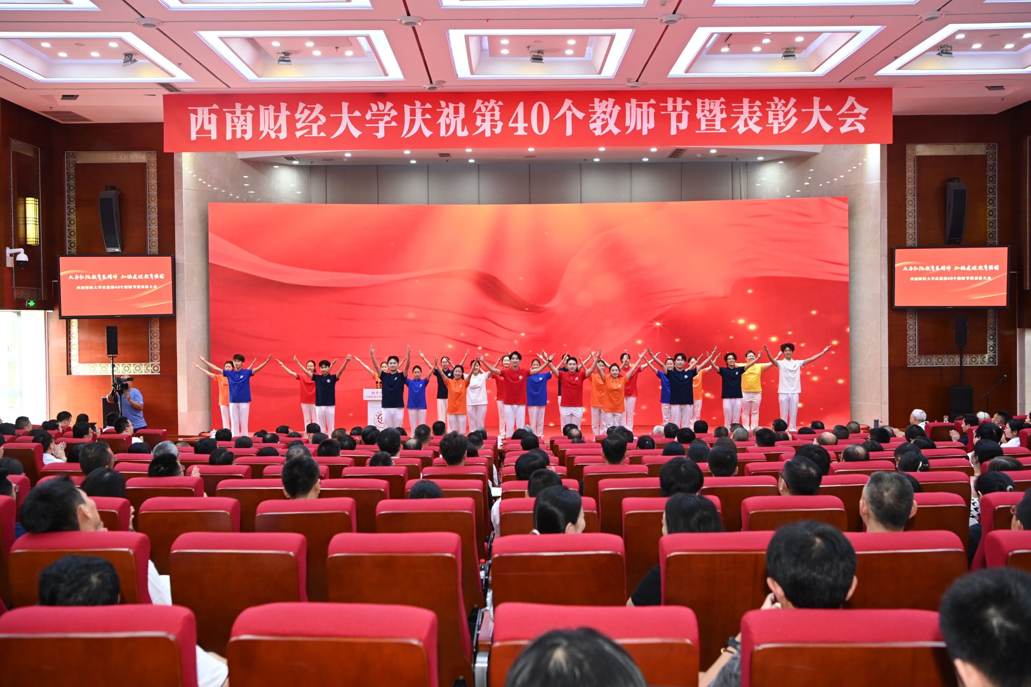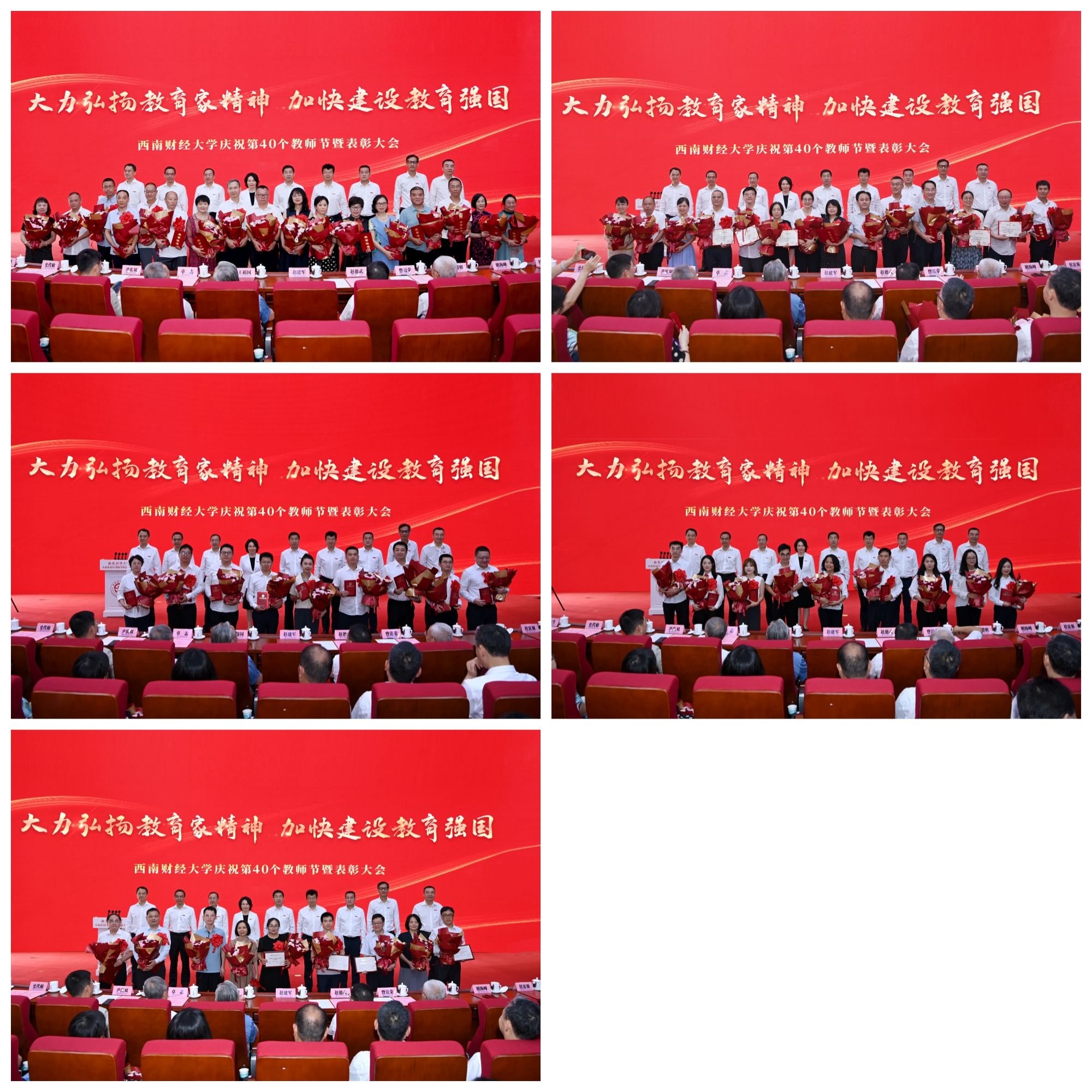 赵建军指出,长期以来,学校党委把隆重庆祝教师节作为弘扬尊师重教传统、加强教师队伍建设、增强教师职业荣誉感的重要载体,成为学校思政工作体系和名师大家文化的重要组成部分。广大西财教师牢记为党育人、为国育才使命,以赤诚之心、奉献之心、仁爱之心投身教育事业,用实际行动培养了一批批优秀人才,诠释出教育家精神的时代底色,彰显出“大国良师”的西财风采。过去一年,全体教师学思践悟“铸忠诚”、躬耕教坛“育英才”、顶天立地“治学问”、经世济民“立新功”,在思想引领、教育教学、科学研究、社会服务等领域取得丰硕成果。