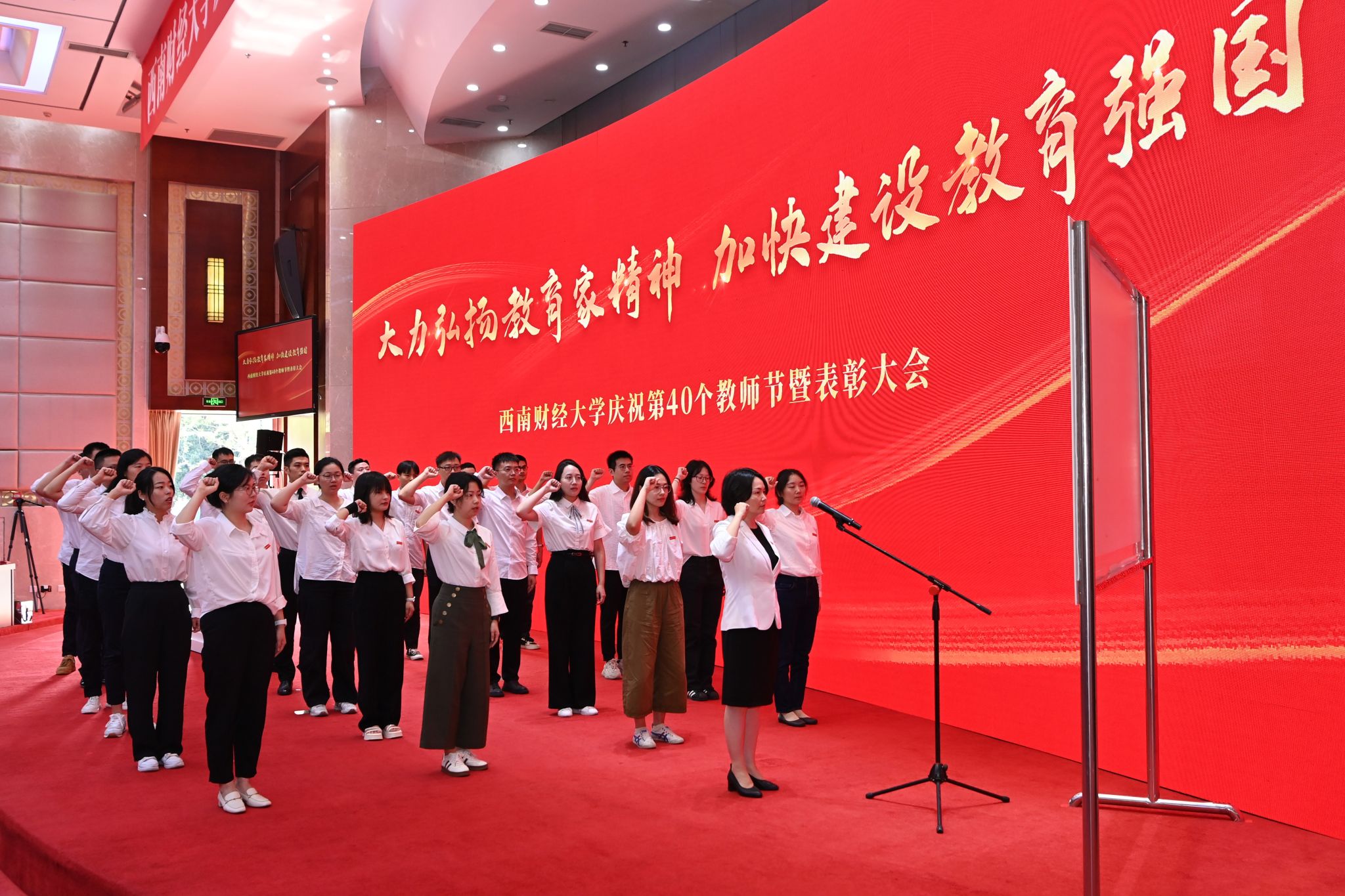 随后,新进教职工代表面对校旗庄严宣誓,将忠于教育事业,履行教师职责,弘扬财经文明,培育华夏栋梁,为实现中华民族伟大复兴而奋斗。