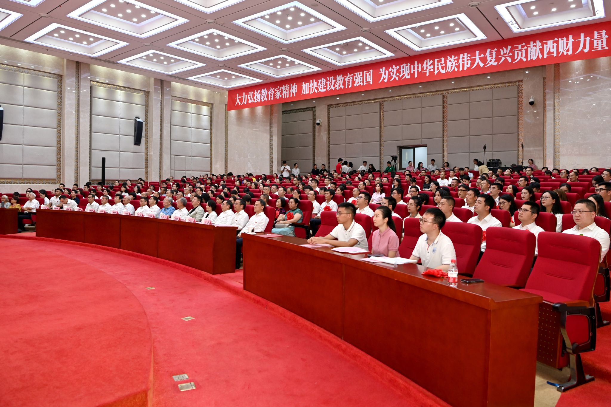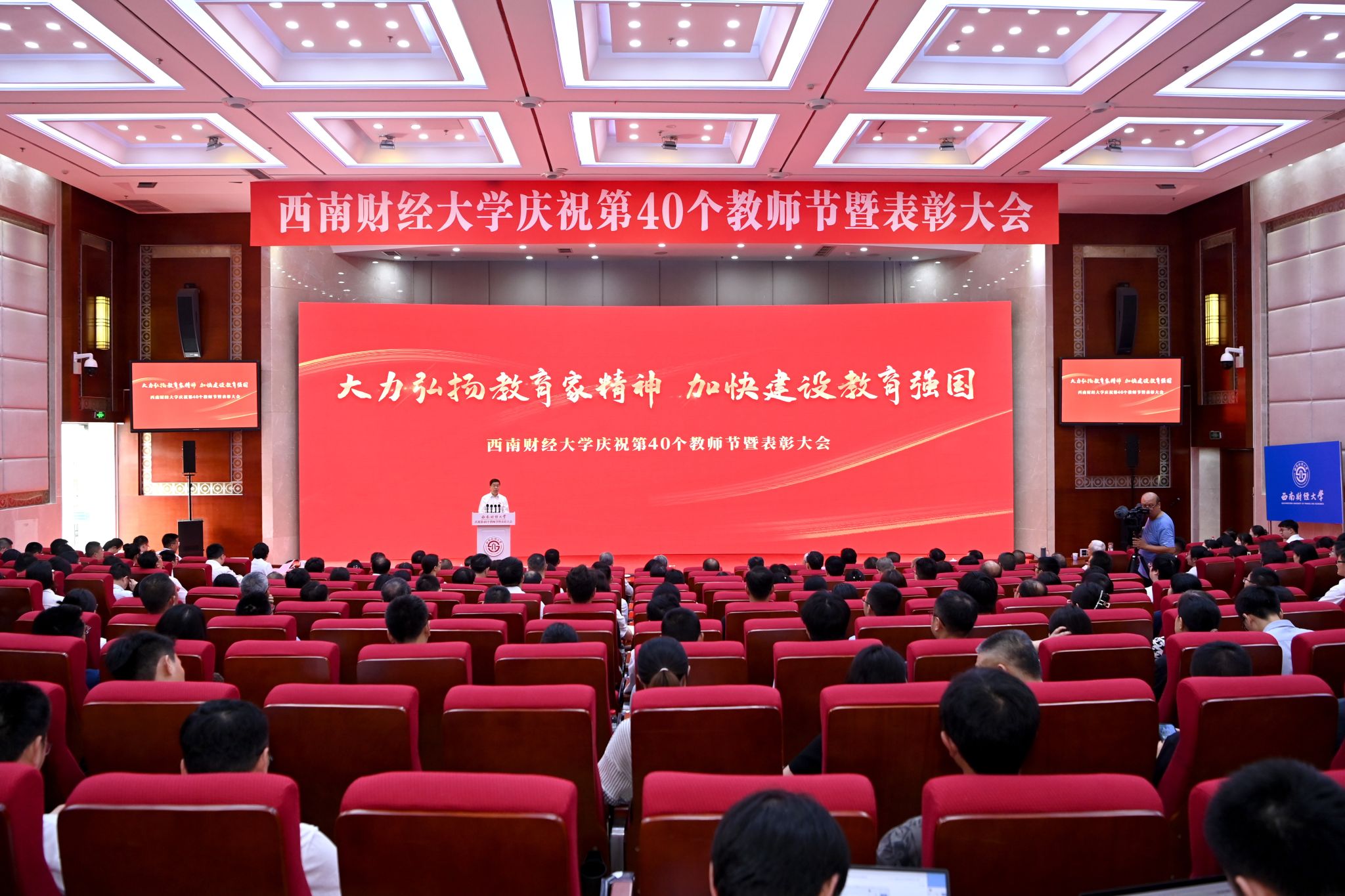 启智润心担重任,深耕杏坛践初心。9月10日下午,学校在弘远楼105会议室举行庆祝第40个教师节暨表彰大会。党委书记赵建军,老领导王裕国、赵德武、卓志、曾道荣、尹庆双,党委副书记、纪委书记孙殿明,党委副书记谢红、明海峰,党委常委、副校长史代敏、桂富强、李志生、马永强、王擎,荣休教师和从教30年教职工代表,获奖教师代表,新入职教职工代表,离退休教职工代表,统战成员代表,港澳台地区教师代表,外籍教师代表,职能教辅部门、学院(研究院)主要负责同志和教职工代表参加大会。