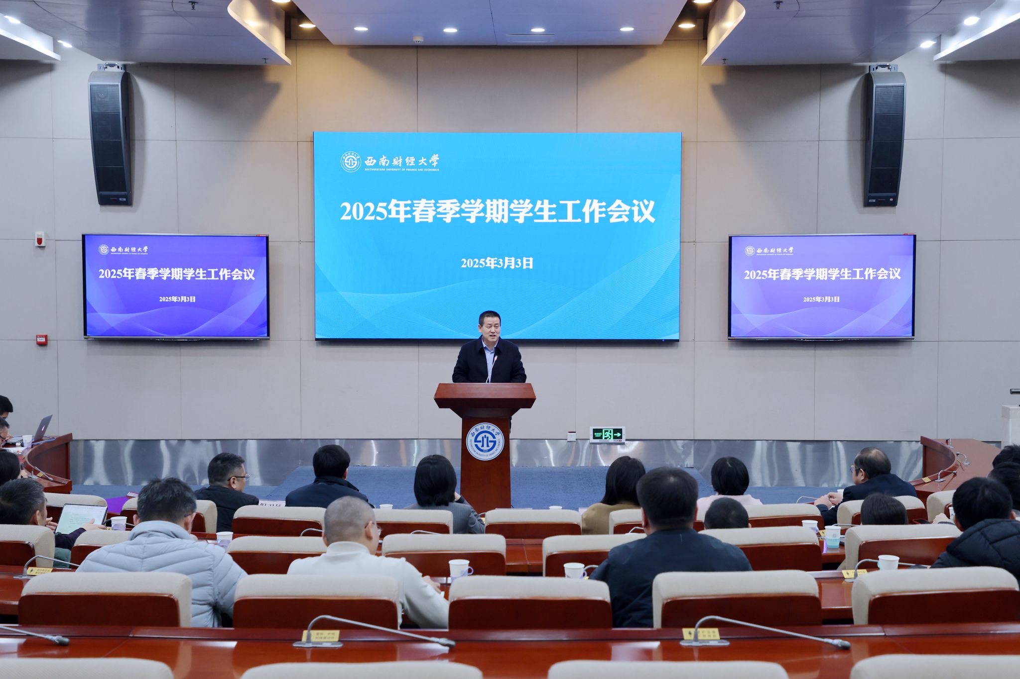 3月3日上午,学校2025年春季学期学生工作会议在弘远楼101会议室举行。党委副书记明海峰出席会议并讲话。学生工作部部长兼心理健康教育中心主任许晓卉主持会议。