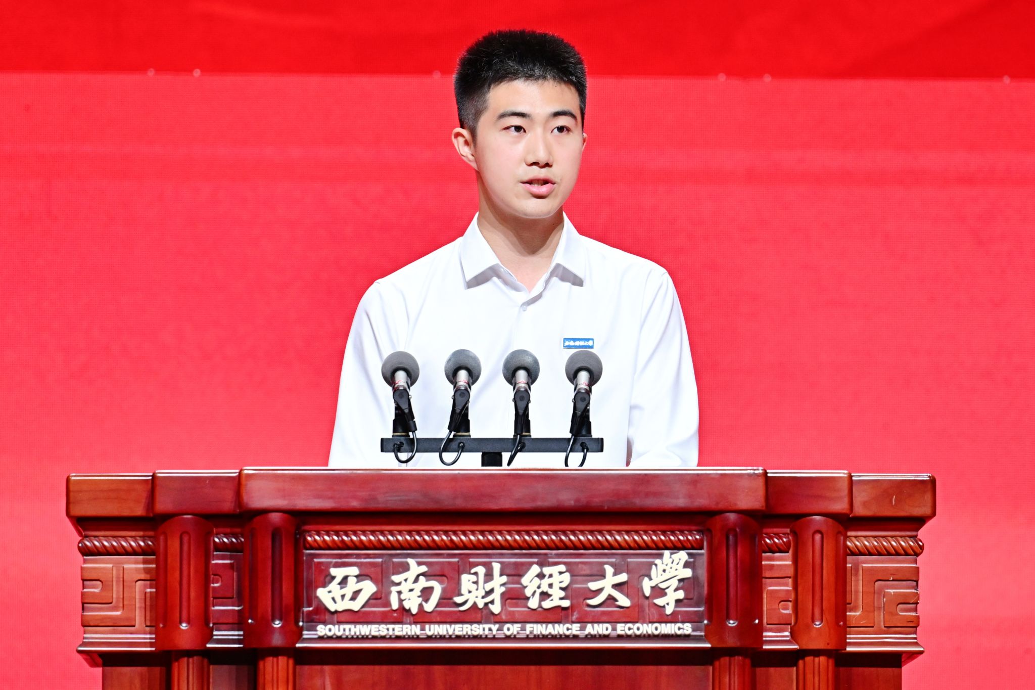 学生代表、国际商学院本科生何昳矾带着满腔热忱献上了对世纪西财的真挚祝福、表达了请祖国放心的青年担当。他表示,全体西财青年将带着母校所滋养的家国情怀、所赋予的求真本领、所淬炼的奋进品格一路成长、一路奋斗,在“新财经”教育中探索求知,在祖国大地上实践奉献,以实际行动兑现“逐梦一流,强校有我;民族复兴,强国有我”的青春誓言。
