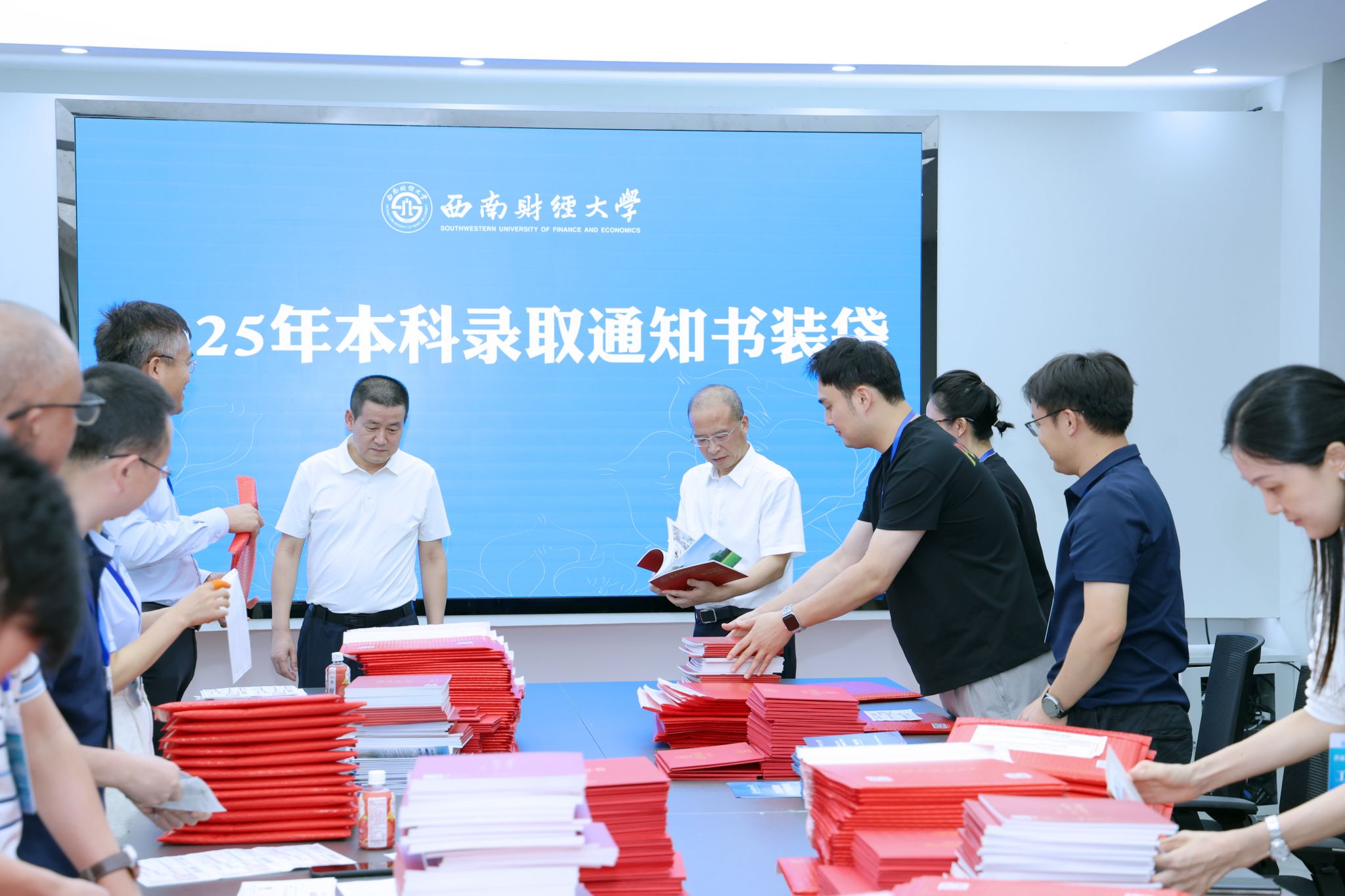 李永强、明海峰在现场详细了解了2025年本科招生录取工作整体安排、进展及生源状况,实地查看了录取数据处理、通知书打印及装袋等环节,听取了学生工作部负责人工作汇报,对招生工作给予充分肯定,向全体工作人员的辛勤付出表示感谢。