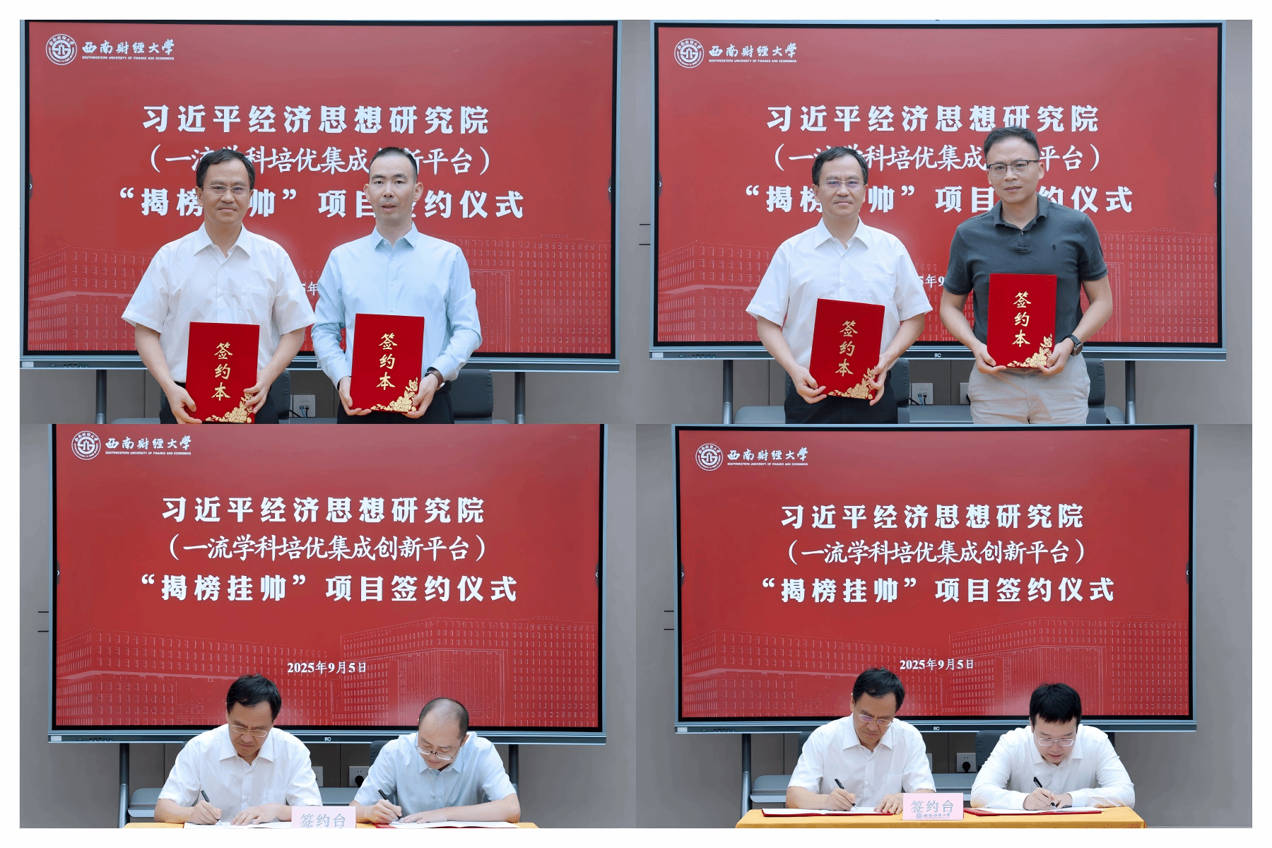 9月5日上午,习近平经济思想研究院在柳林校区诚正楼324会议室举行项目签约仪式,“揭榜挂帅”首批项目正式立项。学校党委常委、副校长、研究院院长王擎出席活动并致辞,研究院执行院长贾晋主持仪式,西南财经大学出版社和首批四个项目团队负责人、联络员参加仪式。