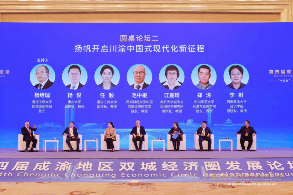 学校党委常委、副校长马永强率队参加并主持圆桌论坛一,学校成渝地区双城经济圈建设与区域协调发展研究智库主任兼首席专家、成渝经济区发展研究院院长杨继瑞主持圆桌论坛二,学校中国西部经济研究院院长毛中根参加圆桌论坛二并发言献策。