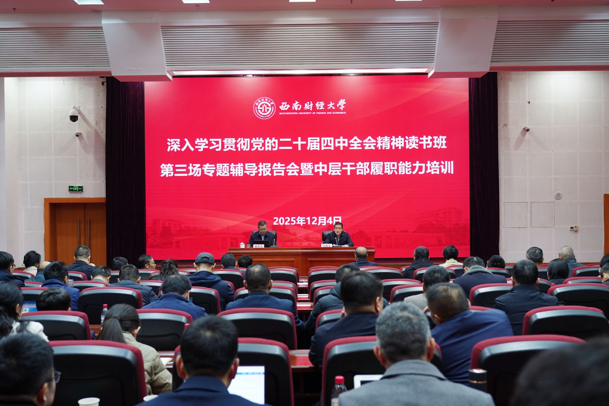 12月4日,学校在腾骧楼137会议室举行深入学习贯彻党的二十届四中全会精神主题读书班第三场专题辅导报告会。学校领导班子成员,党委委员、纪委委员,全体中层干部参加会议。党委副书记明海峰主持会议。