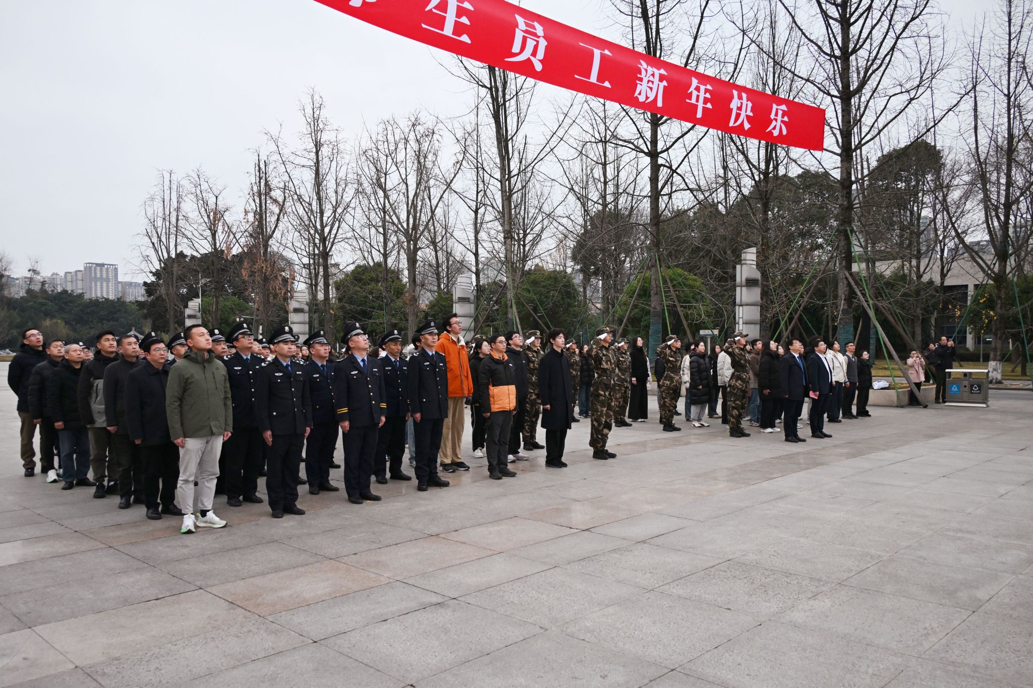 8时30分,仪式正式开始。国旗班成员和校卫队员迈着整齐步伐护送国旗入场。迎着2026年的晨曦,雄壮激昂的《义勇军进行曲》响彻校园,鲜艳的五星红旗冉冉升起。全体师生向国旗行注目礼,爱国热情溢于言表、新年希冀盈盈满怀。
