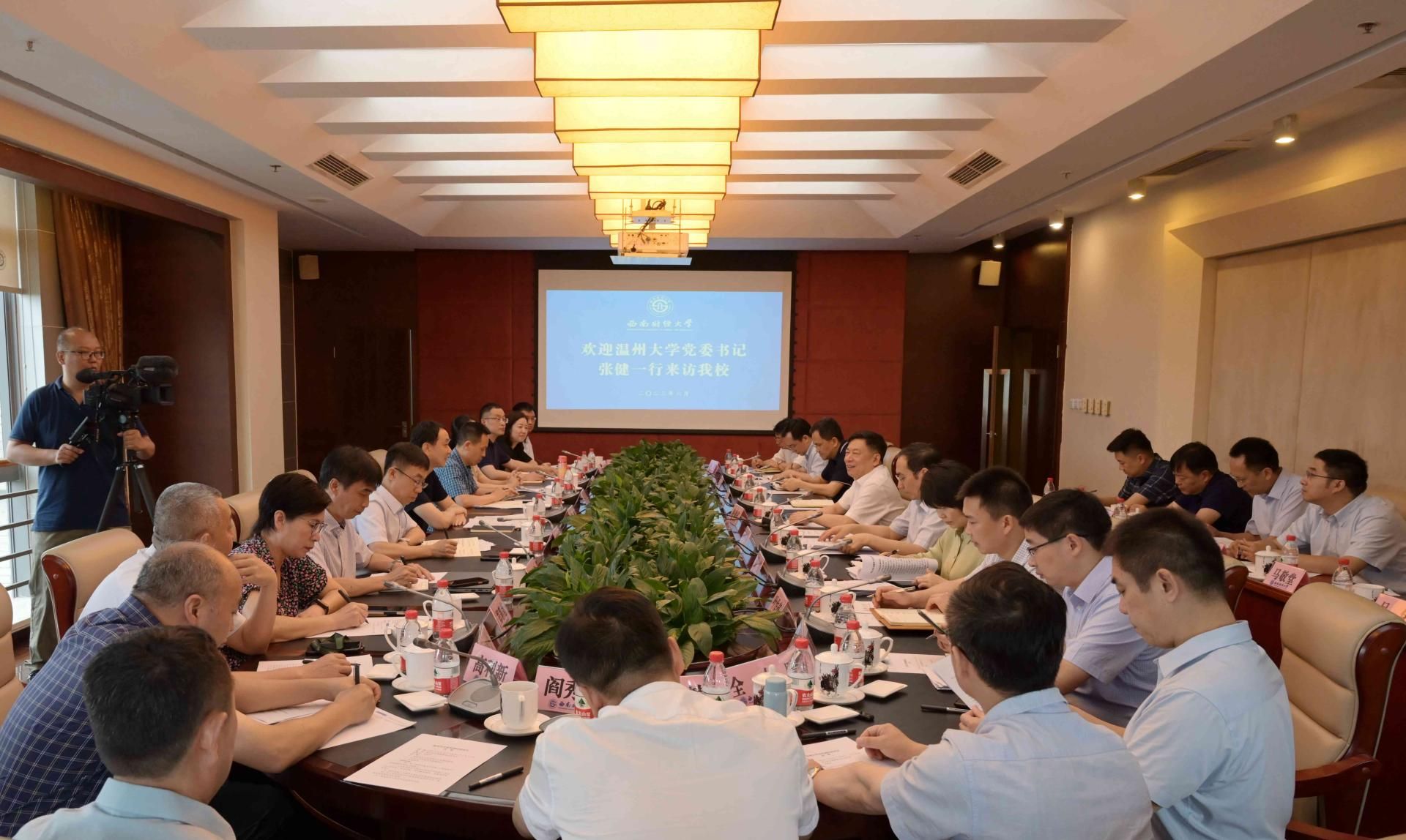 6月26日上午,温州大学党委书记张健一行16人来我校调研。学校党委书记赵德武,党委副书记、校长卓志在贵宾厅会见张健一行。赵德武,党委常委、副校长史代敏出席调研座谈会,相关职能部门和学院负责人参加座谈。