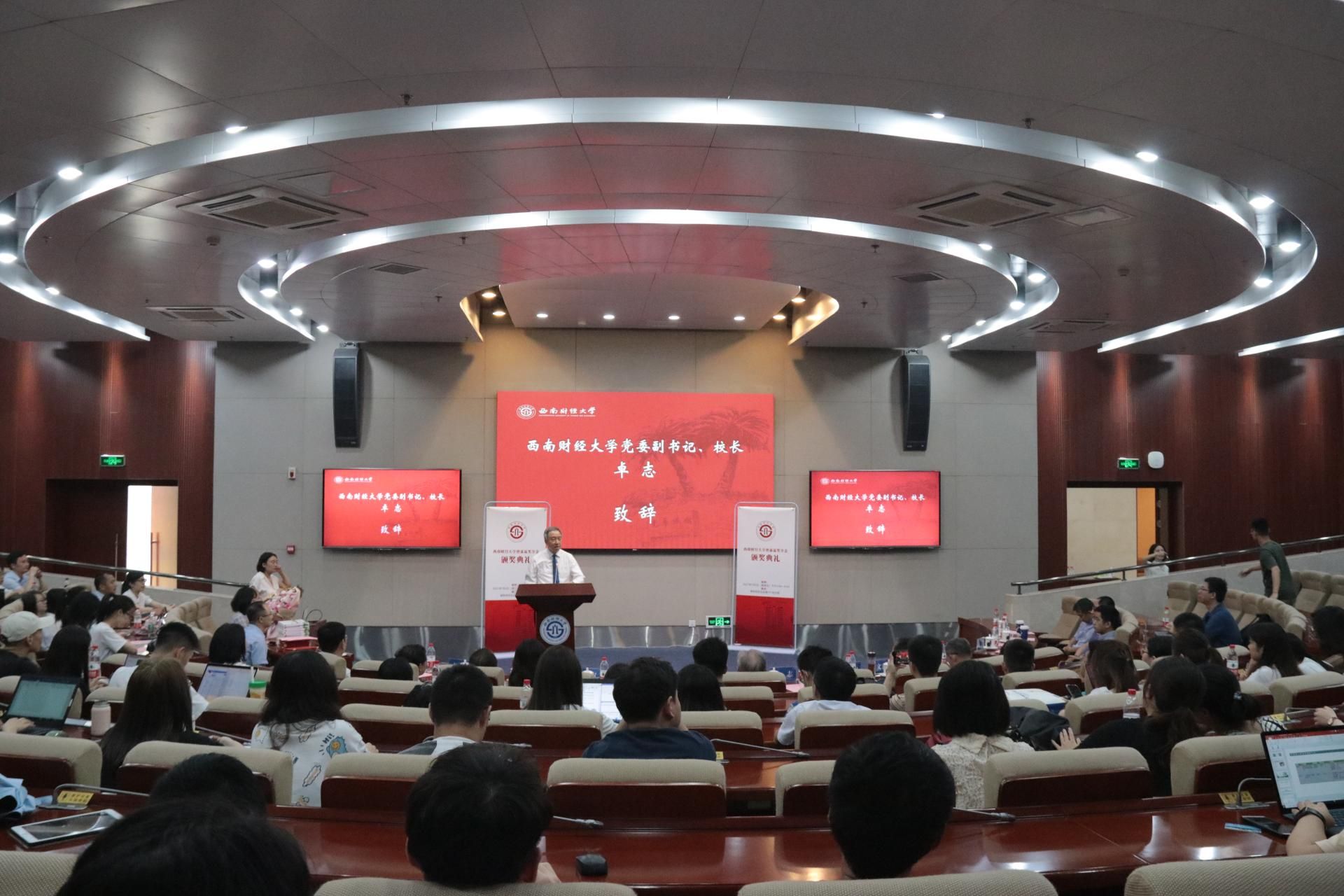 尹庆双宣读了《关于表彰西南财经大学第六届曾康霖奖学金获得者的决定》,鼓励获奖学生再接再厉,在金融学科研究中取得更大成果。他希望全体同学以获奖同学为榜样,在金融学科的星辰大海中与时俱进,不断跋涉学术思想的高峰。曾康霖、卓志、各学院(中心)负责人及获奖学生导师一同为获得本次奖学金的同学颁奖。金融学院副院长罗荣华介绍了本次奖学金评审情况。