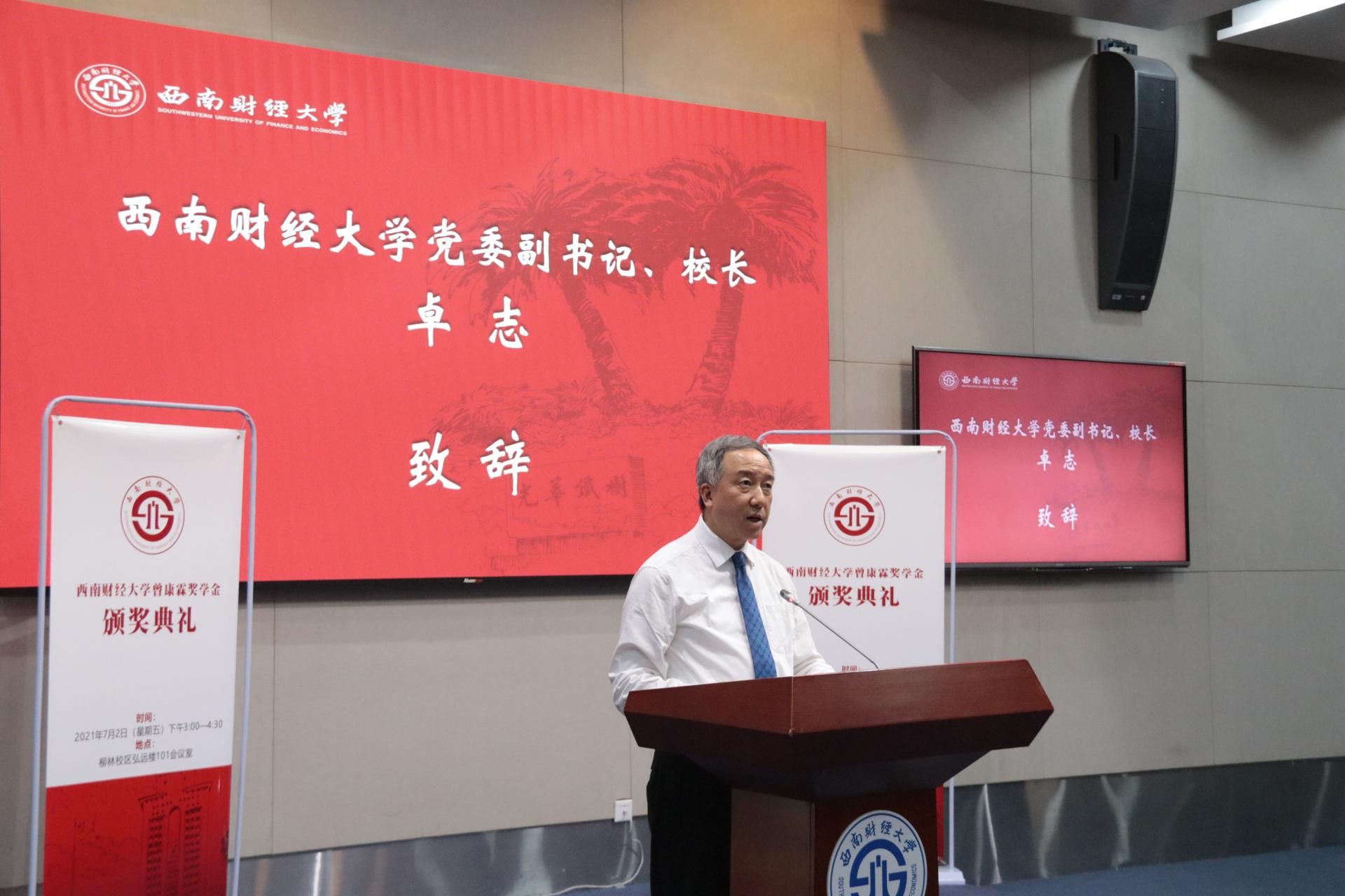 卓志发表致辞,代表学校向曾康霖教授致以诚挚感谢和崇高敬意,向获奖同学表示衷心祝贺。他充分赞扬了曾康霖教授在中国金融学科建设和我校金融学科建设中做出的卓越贡献,并对先生毕生为金融教育事业奉献表达由衷敬意。他表示,曾康霖教授作为金融教育事业的耕耘者,言传身教、诲人不倦,培养出大批国家栋梁之才,其学养、建树和品格备受学界业界及广大学生的敬仰。卓志希望获奖的同学爱党爱国,终身实干,在贡献家国中成就大我,不驰于空想、不骛于虚声,学习新知识、研究真学问、解决真问题,在融会贯通中创新突破。