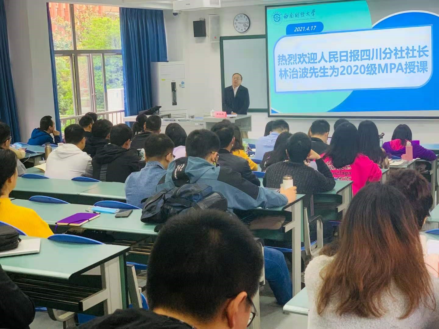2021年4月17日上午,人民日报社四川分社社长林治波教授应邀为我校2020级MPA学生作“从党史的学习中确立精神信仰,汲取前进力量”专题讲座。西南财经大学公共管理学院副院长、MPA教育中心副主任顾绚主持讲座。