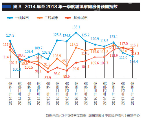 从城市级别来看,自2016年开始,一线城市房价预期持续下跌,从2016年一季度的135.1持续下跌至2018年同期的106.4,且在2017年四季度已经低于二线及其他城市。二线城市房价预期相对平稳。其他城市房价预期从2015年四季度的89.6持续上升,并在2017年同期高于一线城市和二线城市,达到117.0(见图3)。